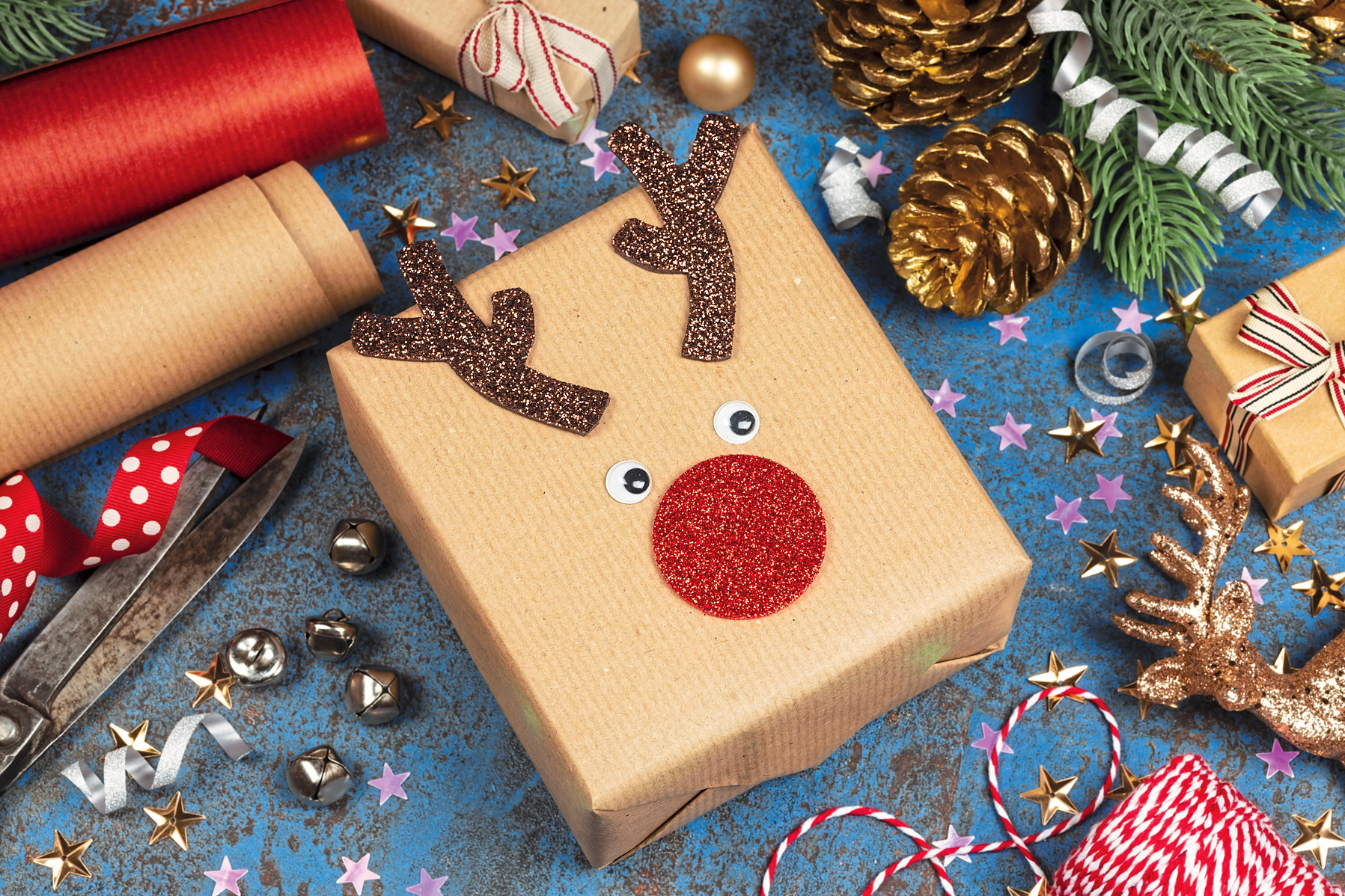 Популярная новогодняя и рождественская тема – северный олень – может найти свое воплощение и в декоре подарочной упаковки. Все очень просто – вырезаешь из цветной бумаги рожки, носик, глазки и наклеиваешь на обычную крафтовую бумагу. Так легким движением руки скучная обертка превращается в веселый сюрприз.