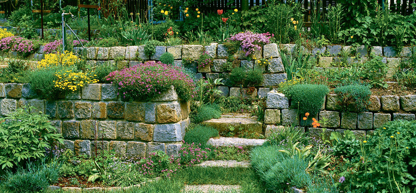 Это невысокий, искусственно созданный холм в несколько ярусов. Растения сажают в кармашки в грунте, которые формируются при укладке ярусов. Камни могут «перетекать» с одного этажа на другой, создавая декоративные выступы. Такая горка располагается на открытом месте и имеет круговой обзор.
