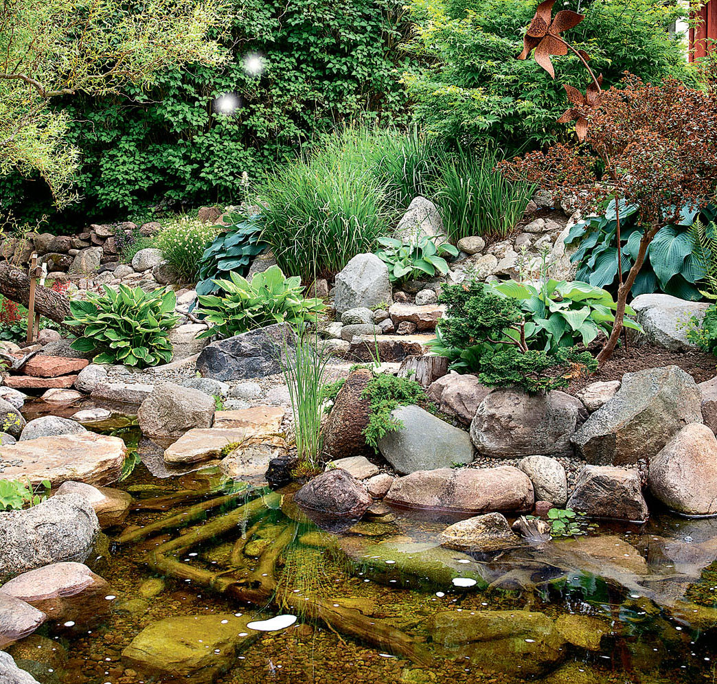 Помимо цветущих видов, можно посадить вечнозеленые саженцы, например, можжевельник, невысокую сосну или компактный сорт канадской ели. Они красиво смотрятся среди камней и будут украшать садик круглый год. На переднем плане высаживают почвопокровные растения и невысокие цветы, а на заднем – кусты и карликовые формы деревьев.
