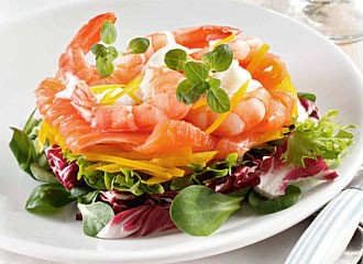 В нашем меню: тарталетки с печенью трески, запеченный паштет, салат с семгой и филе индейки с яблоками.