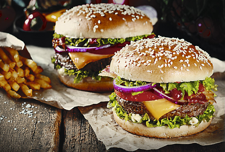 Приготовление. Обжарь котлеты с двух сторон на решетке для барбекю, при желании можно также пожарить бекон. В это время замаринуй лук: порежь на кольца и капни немного уксуса, разведенного с водой. Выложи готовые котлеты на блюдо. Булочки разрежь на половинки, подсуши мягкой стороной на решетке. Собери бургеры: накрой нижнюю булочку листом салата, полей кетчупом, положи котлетку, на нее сыр, затем кружочки огурцов, маринованный лук, горчицу. Сверху прикрой половинкой булочки.
