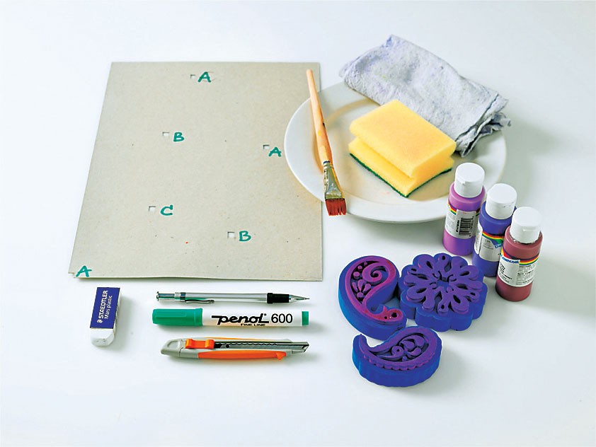 1. Придумай орнамент. На картоне разложи готовые штампы по задуманному рисунку. Центр каждого отметь карандашом и вырежи небольшие отверстия. Пронумеруй или обозначь их так, чтобы каждое отверстие соответствовало определенному штампу. Затем прикладывай картон к стене и переноси центральные точки штампов, отмечая края картона.