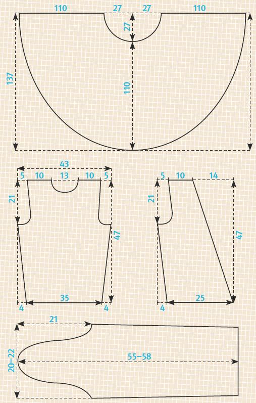 4. Переходи к выкройке верха платья. Перенеси выкройку детали 2,3 и 4 на ткань. Вырежи детали, прибавив вдоль контуров припуски шириной 1 см.