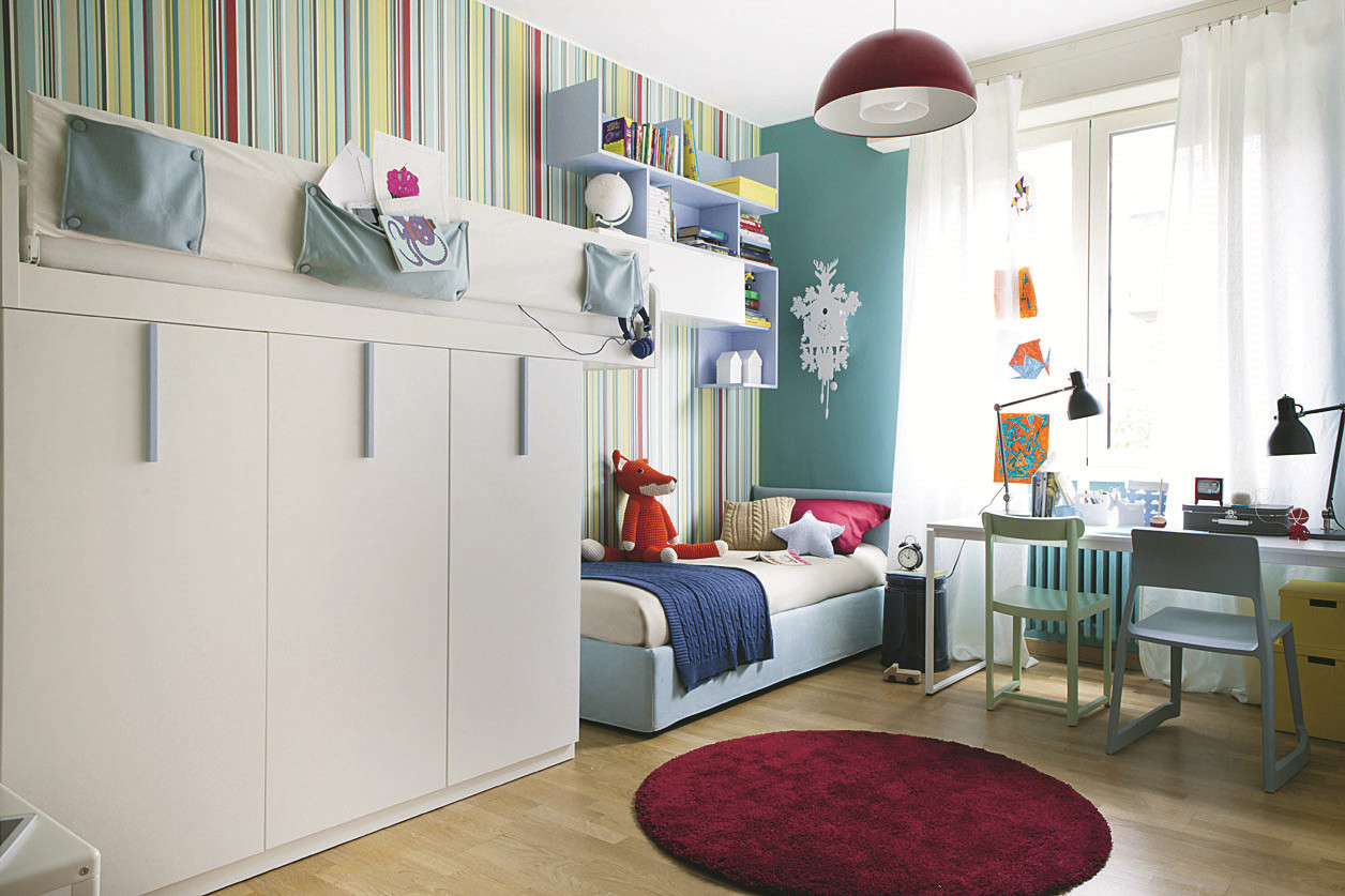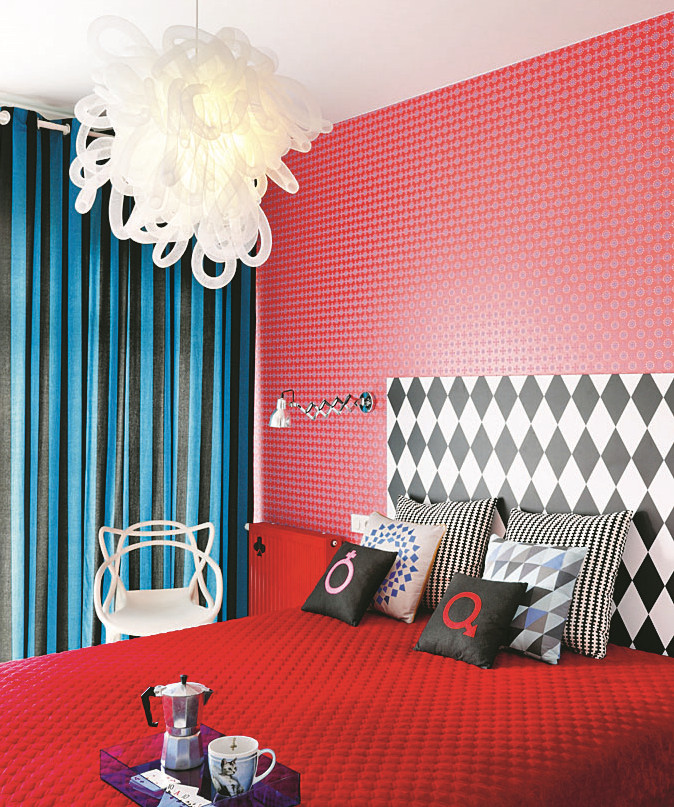 Здесь важно соблюдение пропорций. Покрытие с самым активным цветом или принтом должно занимать наименьшую площадь. Например, самые пестрые обои можно использовать для оформления молдингов, оклеить ими внутреннюю поверхность шкафа с открытыми полками или одну из ниш. Контрастными принтами оформляй противоположные стены комнаты, а между ними располагай обои спокойной расцветки.