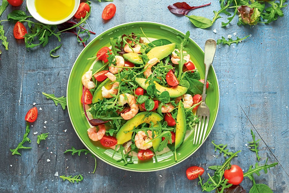Отвари креветки (желательно без соли – ее нужно постепенно убирать из рациона), очисть их. Нарежь ломтиками половину авокадо и помидоры, приготовь зелень. Положи на тарелку рукколу и равномерно разложи сверху остальные ингредиенты. Сверху полей лимонным соком или оливковым маслом.
