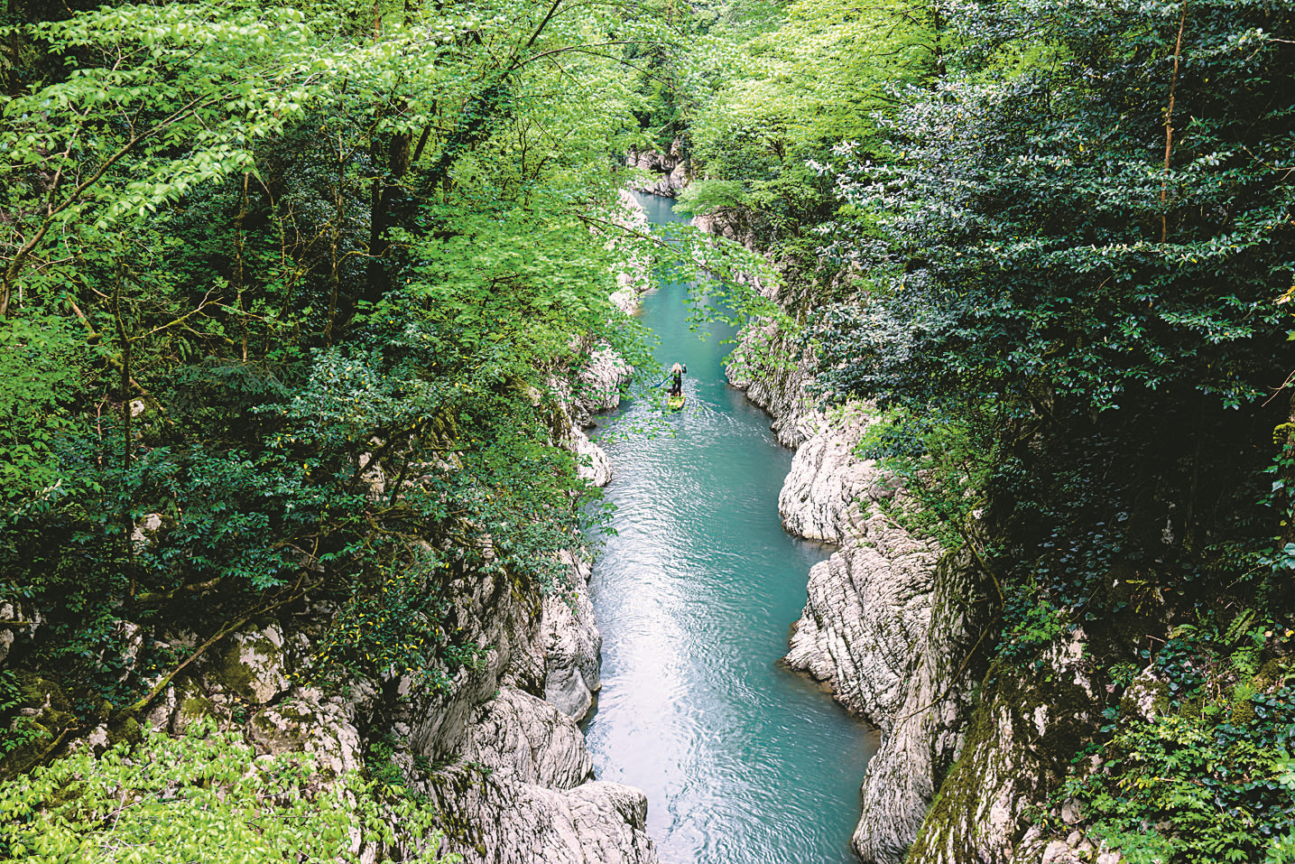 НО НАСТОЯЩИМ ПРИРОДНЫМ ЧУДОМ КРАСНОДАРСКОГО КРАЯ МОЖНО БЫЛО БЫ НАЗВАТЬ ГУАМСКОЕ УЩЕЛЬЕ. Находится оно в Апшеронском районе и проходит вдоль русла реки Курджипс, зигзагами проложившей себе путь между высокими хребтами. По одной из версий, река эта древняя и вытекала из такого же древнего озера, пробив проходы среди гор. Ущелье тянется на 5 км, а в глубину достигает 400 м! Местами расстояние между противоположными скальными стенами сужается до 2 м. И представь себе, что в этой теснине в 1930-е годы была построена узкоколейка! Цель была чисто утилитарная – перевозка грузов. Но уж больно проблемный путь оказался – камнепады, оползни… И дорогу постепенно забросили. Сейчас на некоторых участках ее удалось успешно восстановить, а на одном из них весело бегает туристический поезд.
