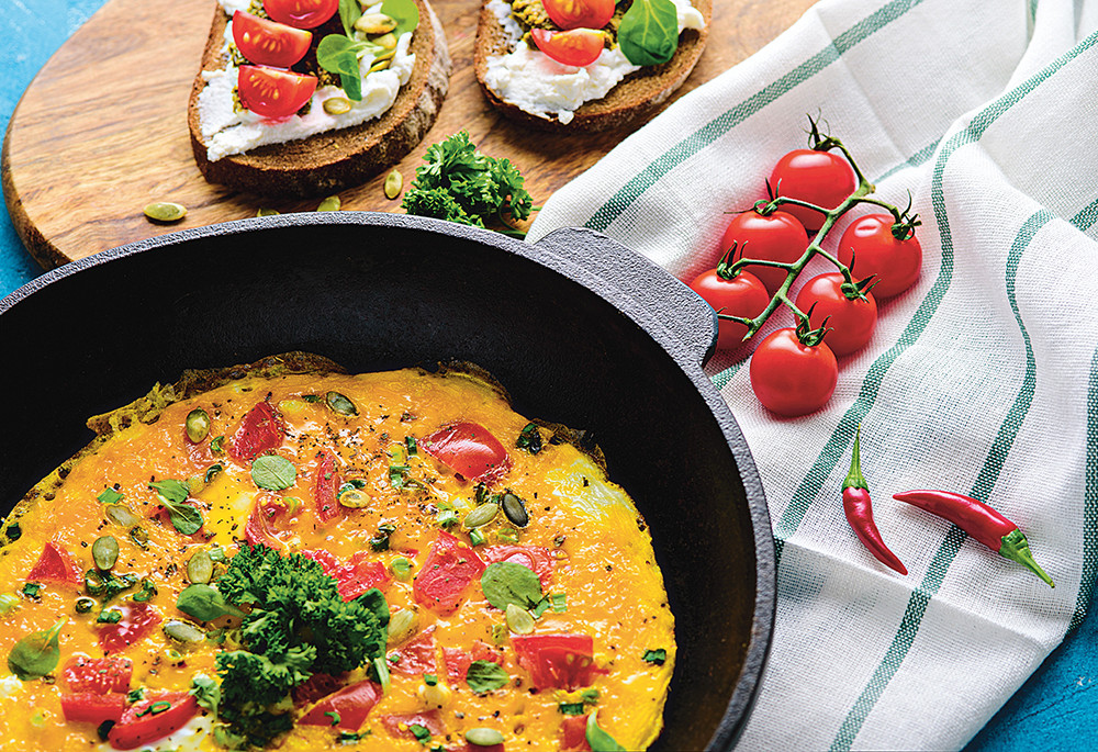Утренний омлет с овощами и цельнозерновым хлебом – прекрасное решение для повышения энергии.