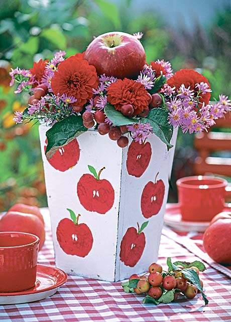 Сделай из яблока штамп и преобрази с его помощью скучную белую вазу. Разрежь фрукт пополам, нанеси на срез яркую краску и штампуй. Листик и черенок дорисуй кисточкой.