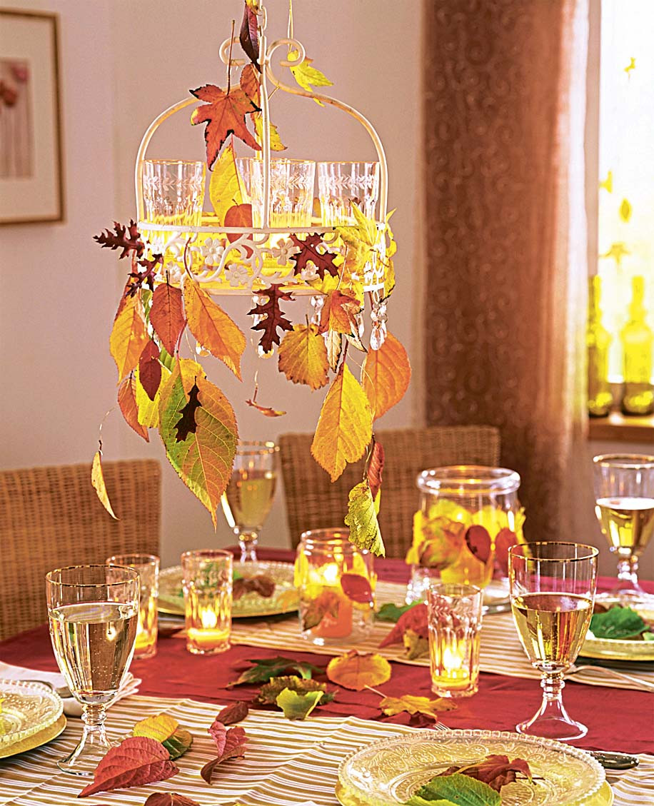 Лучше всего для этого подойдут багряные листья японского клена и красные ягоды – рябины, калины, боярышника, барбариса. Ими можно украсить приборы, бокалы или просто поставить в вазу на столе живописным букетом.