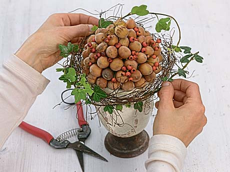 Понадобятся: • плоды лещины (лесного фундука) • ягоды • ветки с листьями • горшок • теннисный мяч • клеевой пистолет