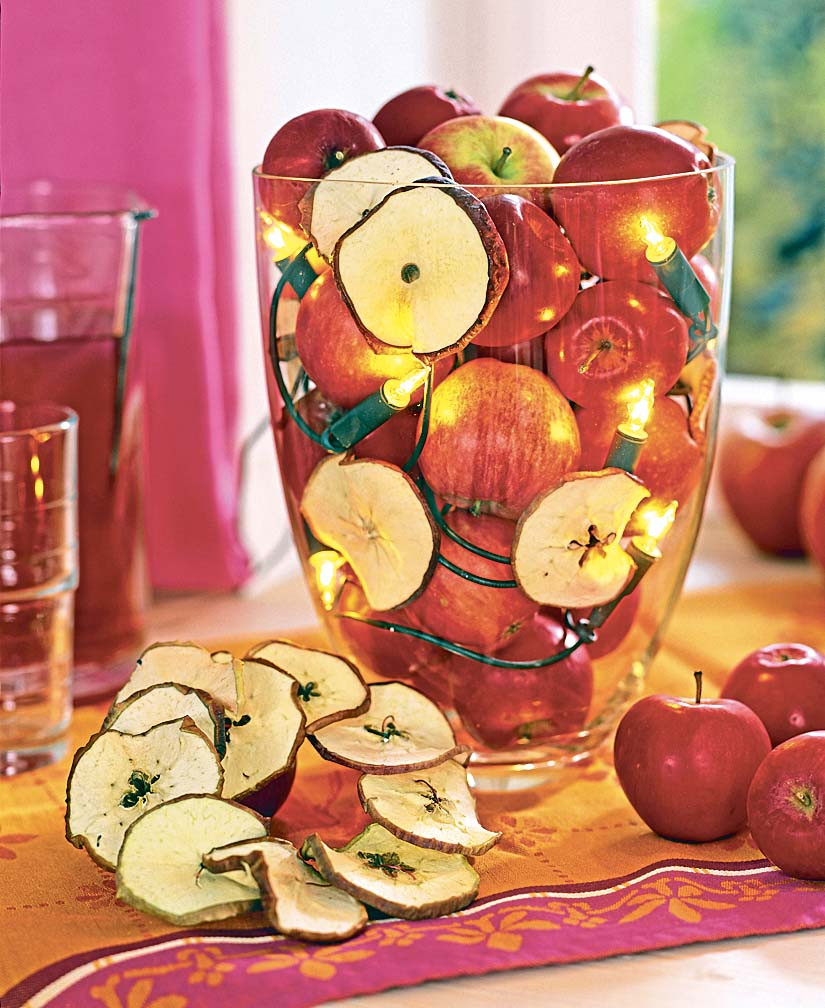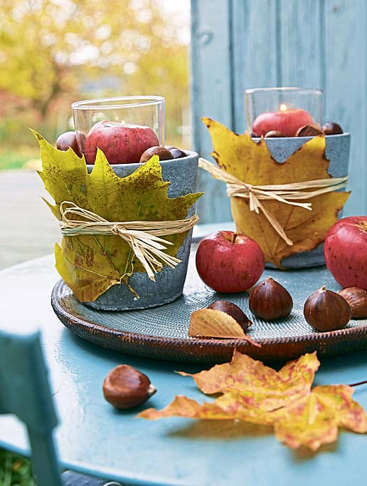 В красных яблоках вырежи серединку – так, чтобы в отверстие поместилась плоская свеча. Заполни цветочный горшок каштанами, укрась листьями и помести в него бокал с яблоком-подсвечником.