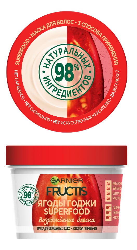 Регулярное окрашивание поддерживает желаемый цвет волос. Но в то же время и подвергает их агрессивному воздействию красителей. Важно защищать их, обеспечивая правильный уход. Его дает маска SUPERFOOD с экстрактом ягод годжи. Она питает волосы и сохраняет яркость цвета. Ягоды годжи являются мощным антиоксидантом и одним из любимых продуктов веганов. Маски SUPERFOOD тоже можно назвать веганскими, потому что в их формулах – 98% веществ растительного происхождения.