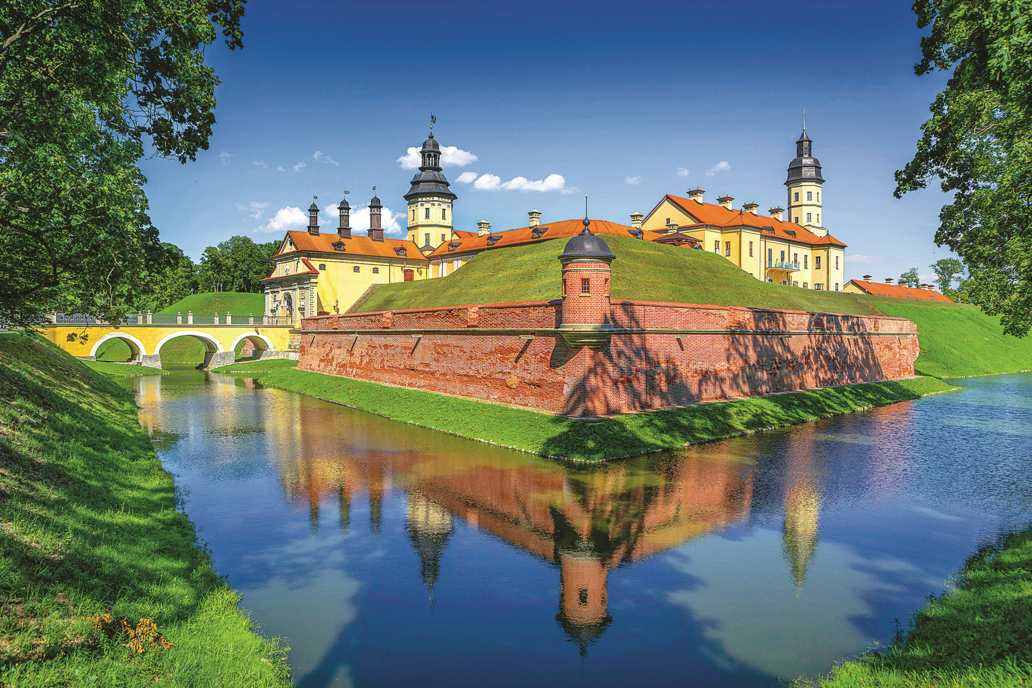 Но в этом тандеме всегда выигрывает Несвижский замок. Мирский по сравнению с ним выглядит аскетично, а залы чаще занимают музейные витрины с экспонатами. А вот Несвижский удалось «реанимировать» по полной! Это внушительный дворцово-парковый комплекс с великолепными залами. Сам замок стоит на возвышенности и окружен рвом с водой. Его неоднократно захватывали и разрушали, но каждый раз полностью восстанавливали, после чего он становился все краше, превращаясь из фортификационного сооружения в настоящий дворец. Да, его хозяева, князья Радзивиллы, любили роскошь.