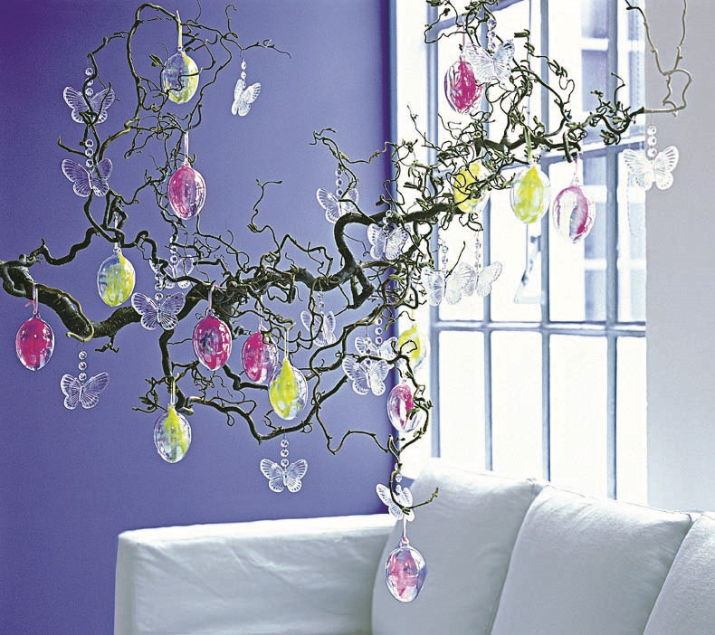Легкие и изящные стеклянные украшения выглядят очень стильно и не утяжеляют пространство. Можно украсить сухие ветки стеклянными яйцами. Или подвесить цветы в прозрачных вазах.