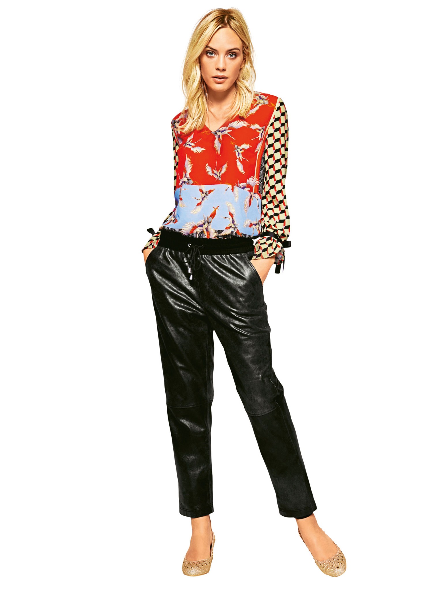 Легинсы и брюки из кожи составят хорошую компанию объемному джемперу или блузе из легкой ткани. К цветным брюкам подбирай однотонный верх и наоборот.