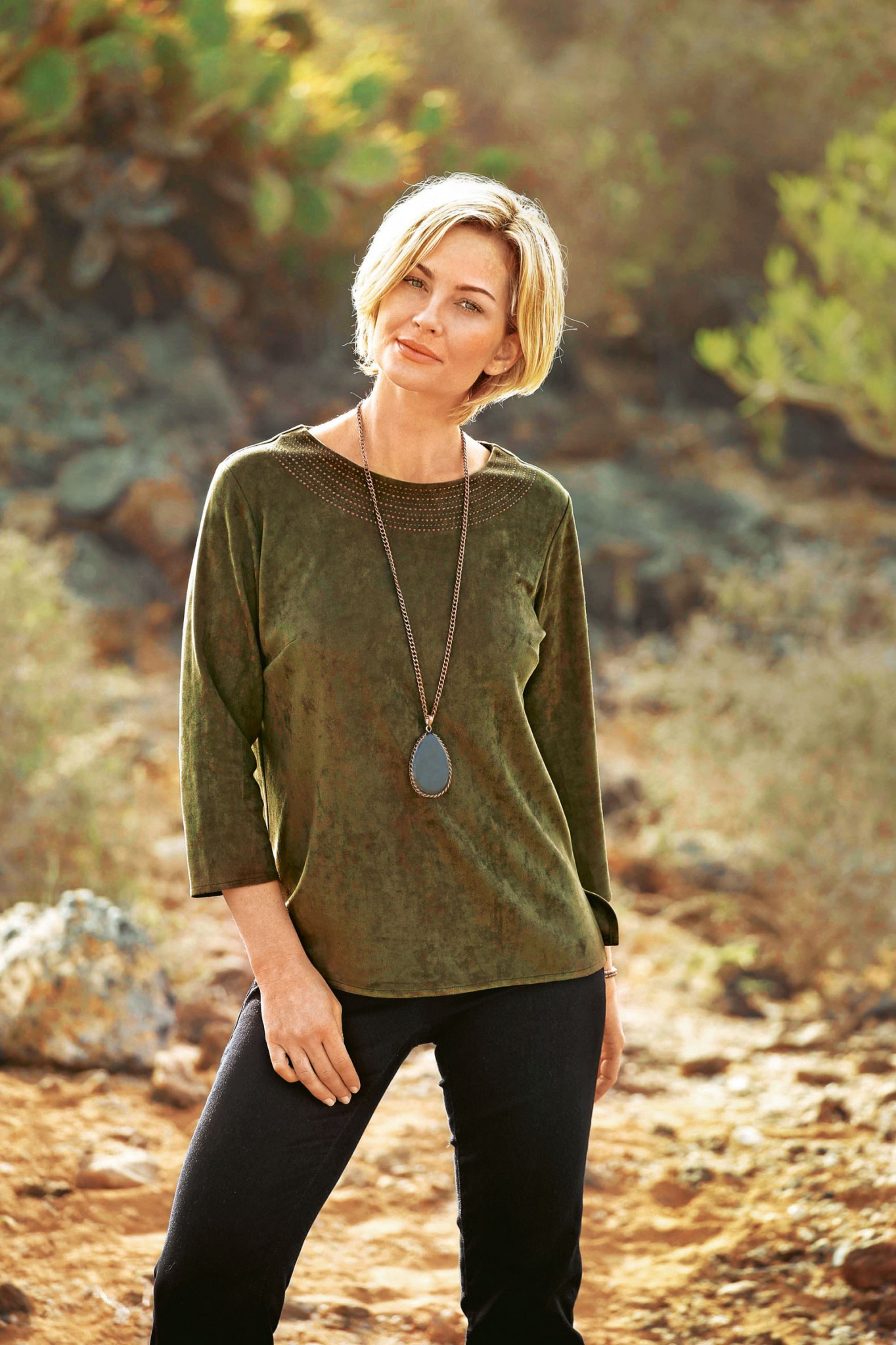 Замшевую тунику носи с черными брюками или джинсами — чтобы фактуры сочетались между собой, джинсы должны быть без потертостей. Платье из замши дополняй крупными украшениями в этническом стиле и невысокими ботильонами.