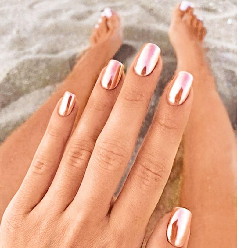 На смену графитовому и песочному покрытиям пришло хромовое. Однотонный маникюр можно «разбавлять» еще одним ультрасияющим лаком: например, поставить бронзовый блик на каждом пальце.