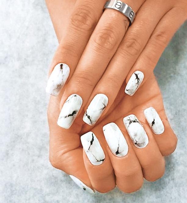 Основу этого маникюра образует матовый белый лак, а «мраморные» вкрапления имитируются серым и черным оттенками.