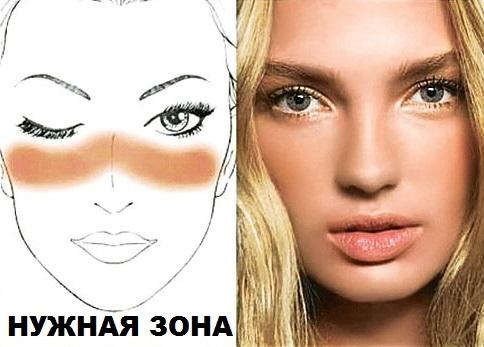 Возьми самый светлый оттенок бронзовой пудры и широкой кистью растушуй его снизу вверх под скулой, от висков по границе лба и под подбородком.
