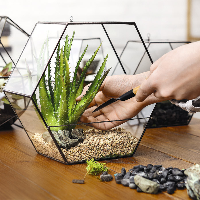 Кактусы с суккулентами высаживают в условия, близкие к пустынным. Эти композиции – находка для новичков, их несложно собрать, растения в них живучи, а выглядят такие инсталляции эффектно. В отличие от «тропиков» и «гор» в этом случае лучше подобрать открытую тару – с широким горлышком или без одной стенки. Иначе влажность слишком увеличится, почва будет долго просыхать, а суккуленты этого не любят. Грунт понадобится рыхлый, добавление песка тоже будет кстати. Поставить такой флорариум можно на подоконник или в другое солнечное место.