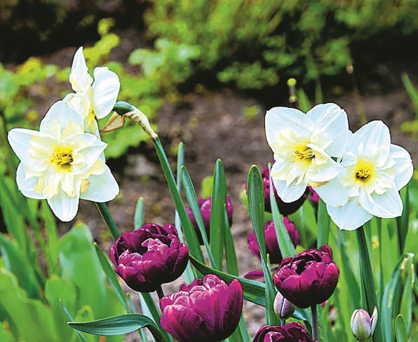 Это классика: белые нарциссы и тюльпаны любых сортов, но непременно сочные и яркие. Нарциссы высаживай куртинами, по несколько луковиц.