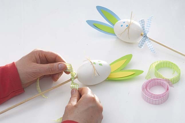 4. Вставь палочку (подойдут для суши). Осторожно закрепи их в отверстии скорлупы и перевяжи лентой.