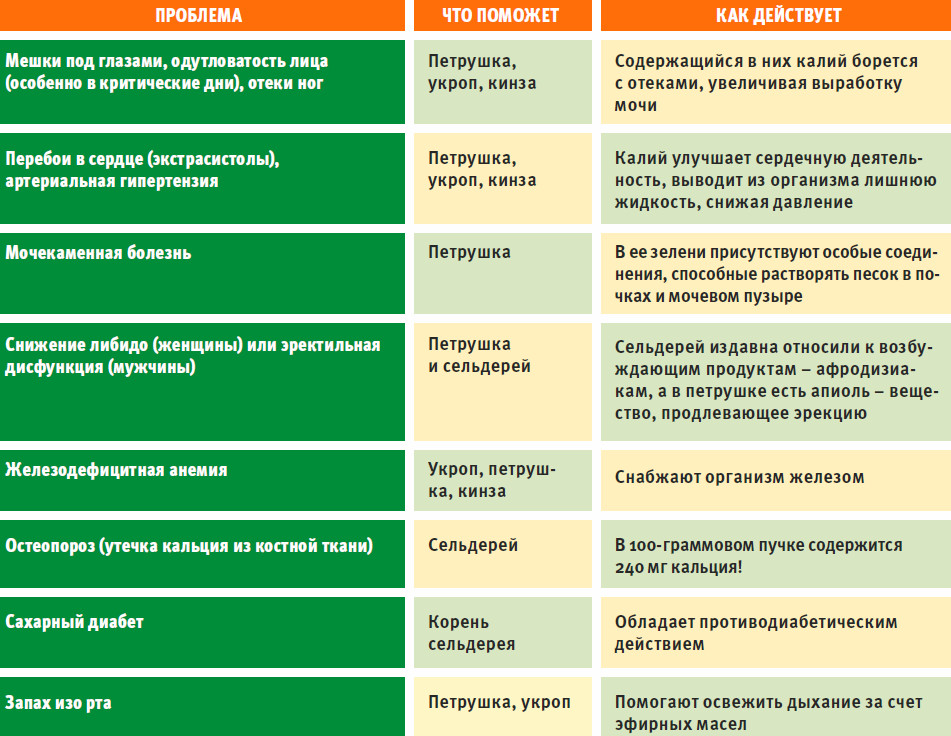 Укроп и петрушка обязаны эфирным маслам приятным вкусом и запахом, витамину С – способностью бодрить и укреплять защитные силы организма, а свойством придавать глазам кошачью зоркость в темноте и возвращать младенческую бархатистость коже – каротину (провитамину А). Кроме того, веточки этих растений благодаря содержащемуся в них калию обладают мочегонным эффектом. А еще они всегда готовы поделиться железом с красными клетками крови – эритроцитами, доставляющими кислород к тканям.