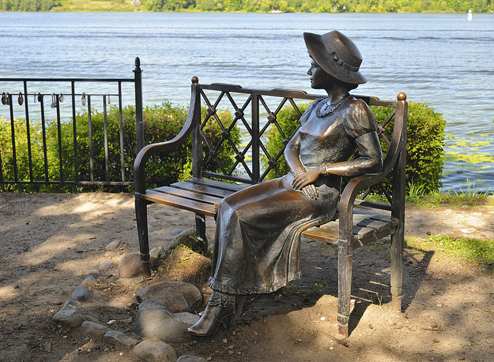 «Классика жанра» – фото на набережной со скульптурами «Дачница» и «Кошка Муха». Прототипом для первой послужила спутница Левитана, а вот насчет Мухи мнения расходятся: по одной из версий, она отважно спасала своих котят, по другой – просто была симпатичной особой.
