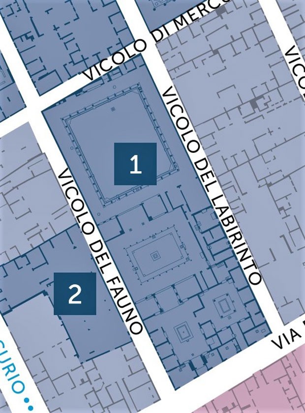 Стены по обе стороны от входа несли на себе множество надписей, из которых практически ничего не сохранилось. Значит, эта улица обладала высокой проходимостью, что неудивительно, — в нескольких минутах ходьбы от Дома Фавна располагались Форумные термы и сам Форум.
