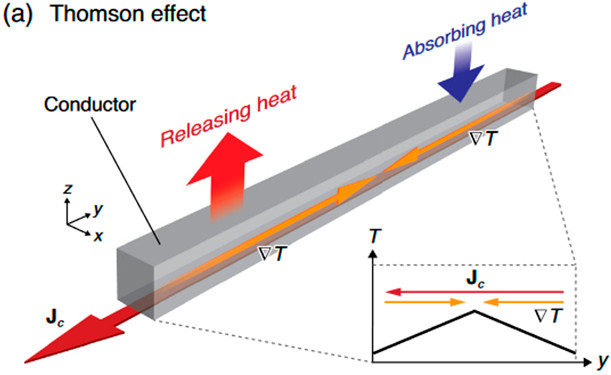 Термоэлектрические эффекты были открыты в середине XIX века и уже давно нашли применение в термопарах, элементах Пельтье и преобразователях тепла в электричество. Эффекты Зеебека и Пельтье дополняют друг друга: в одном под действием градиента температуры возникает разность потенциалов на местах спайки, а в другом возникает разность температур из-за разности потенциалов. В то же время эффект Томсона объединяет в себе эти два эффекта: если и запустить по проводнику ток, и поддерживать в нем неравномерность температуры, в одной области дополнительно будет выделяться томсоновская теплота, а в другой области она будет поглощаться. Эта теплота пропорциональна плотности тока и градиенту температуры в области.