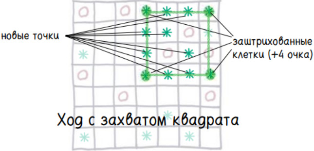 3. Чтобы захватить квадрат, требуется один ход. Для этого заштрихуйте его угловые клеточки, приносящие вам по одному очку, и поставьте точки во всех пустых клеточках внутри и по периметру квадрата.