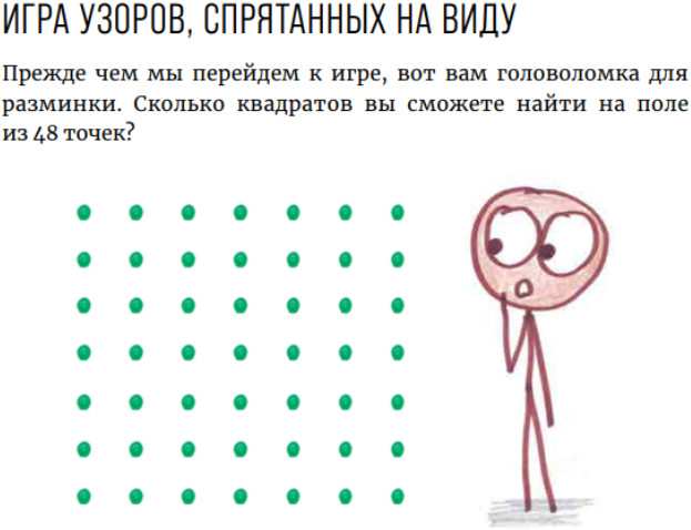 Готово? Ну, подозреваю, кое-что вы проворонили. Но не принимайте это близко к сердцу. Умение смотреть и видеть приходит не сразу. Поэтому непросто добиться мастерства в нашей следующей игре. Лучше всего это сформулировал тестировщик Скотт Миттман: «Часто говорят, что люди видят сложные узоры там, где их нет (на звездном небе, в облаках, чернильных кляксах, экономических данных)... А эта игра показывает совершенно противоположное: неспособность видеть простые узоры там, где они есть».