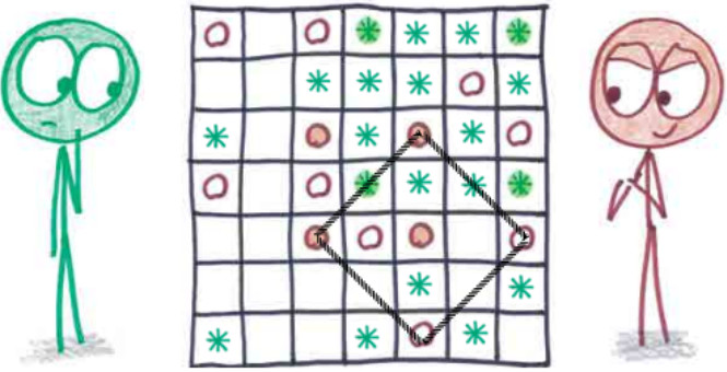 Для некоторых развлечений достаточно ручки, бумажки и, возможно, игральных костей. Зато от участников потребуется математическое мышление и четкое соблюдение правил. В книге «Математические игры с дурацкими рисунками: 75¼ простых, но требующих сообразительности игр, в которые можно играть где угодно» (издательство «Альпина нон-фикшн»), переведенной на русский язык Алексеем Огнёвым, преподаватель Бен Орлин рассказывает, как люди соревнуются друг с другом в логике, стратегическом и пространственном мышлении. Предлагаем вам ознакомиться с фрагментом, посвященным игре, в которой нужно видеть квадраты в скоплении точек.