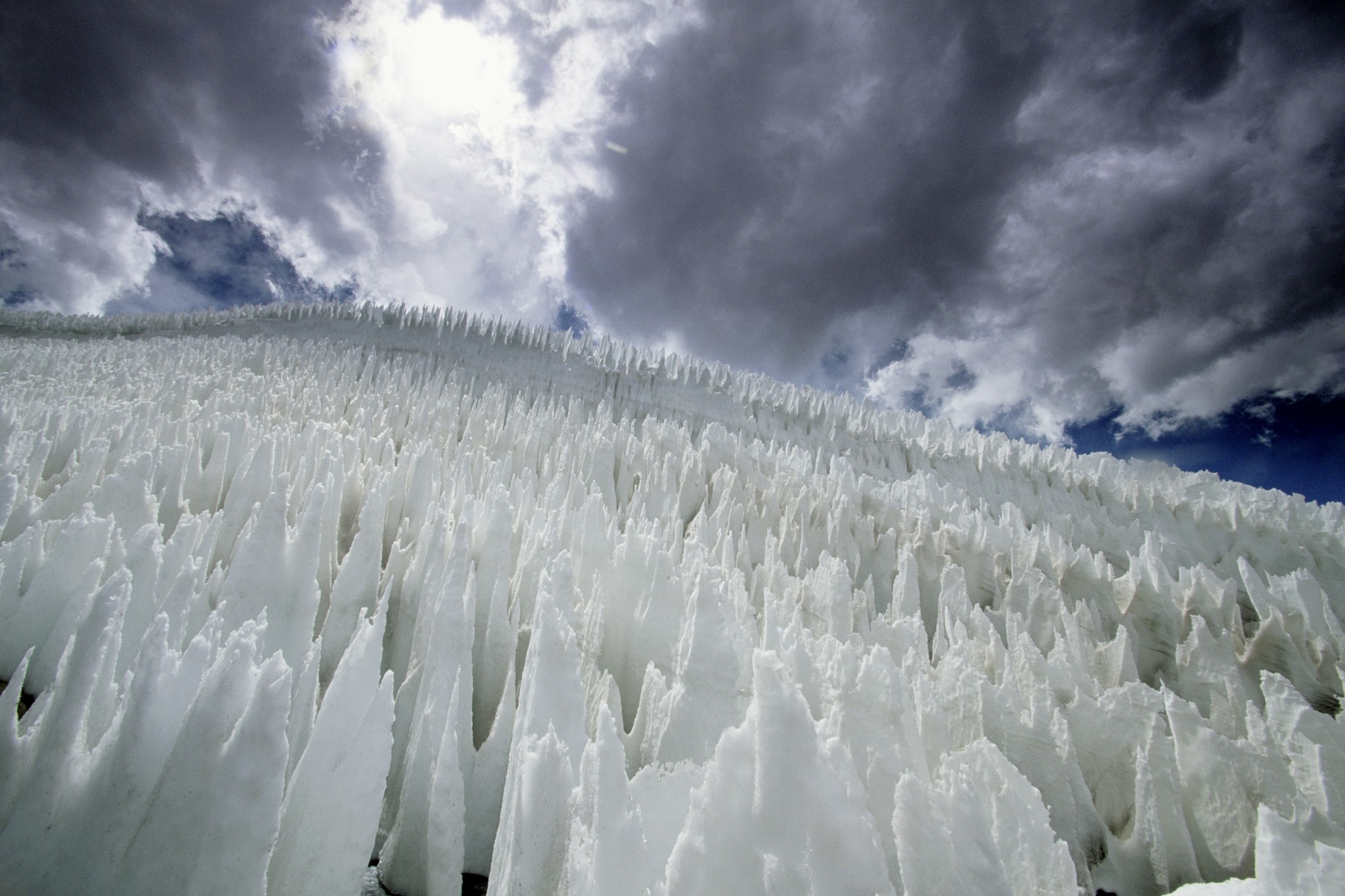 Ученые по-разному кличут эти ледяные шипы – то кальгаспорами, то пенитентесом. Но в переводе эти слова означают примерно одно и то же: кающийся снег. Впервые их описал модный в XIX веке ученый Чарльз Дарвин. Он столкнулся с кальгаспорами по дороге из Чили в Аргентину и рассказал о них в книге 1839 года издания. Издалека такие шипы и столбы и впрямь похожи на кающихся монахов. Или на куклуксклановцев, которые уткнулись в землю лицом, заметив съемку скрытой камерой.
