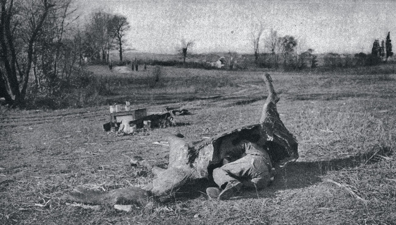 Удачные опыты французов заставили и британских союзников присмотреться к маскировке. На Острове тоже нашлись художники, готовые помочь своей армии. Так, Симингтон придумал использовать для маскировки не тяжелые и слишком «парусные» при сильном ветре холсты, а почти современные маскировочные сети. Он даже костюм для солдата из такой сети предлагал шить. Для защиты своих снайперов англичане начали промышленно изготавливать скульптурные макеты. На нейтральной полосе всегда валяется много всякого. Это и обломки зданий, неудачно оказавшихся между позициями воюющих армий, и трупы. Очень часто снайперы прятались за сделанными из папье-маше и ткани на деревянном каркасе «трупами лошадей». Лошадки тоже становились безвинными жертвами человеческих разборок, ведь и буксировка артиллерии, и подвоз припасов, да и просто кавалерийские атаки – все это сопровождалось потерями конского состава. Раздутые трупы лошадей месяцами валялись на ничейной земле, оставаясь привычными объектами для наблюдателей с обеих сторон. Прятаться в чреве настоящей дохлой лошади – так себе удовольствие. А вот если за ночь подменить труп обманкой – совсем другое дело. Правда, если враг заподозрит подмену, то снайперу не сдобровать. Такие случаи бывали, если «дохлая лошадь» вдруг появлялась перед германскими позициями в таком месте, где никаких кавалерийских атак сроду не было. Немцы очень удивлялись и... на всякий случай вызывали огонь артиллерии.
