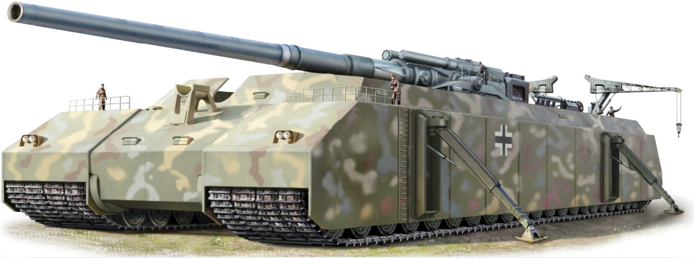 К счастью, в 1933 году конструктор Гротте вернулся в Германию, чтобы послужить «фюреру и отечеству». Ну и послужил. На его чертежной доске родились проекты чудовищных танков: проект предложенного Гитлеру в июне 1942 года тысячетонного P.1000 Ratte («Крыса») с башенной установкой 283-миллиметровых корабельных артиллерийских орудий того же типа, что и на линейных крейсерах типа «Шарнхорст», а ближе к концу войны – проект самоходной установки Landkreuzer P.1500 Monster с 807-мм пушкой «Дора» и массой уже в полторы тысячи тонн.