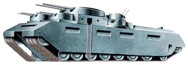После среднего танка ТГ-1 массой 25 тонн, который был по конструкции весьма новаторским, но слишком сложным для отечественной промышленности, Гротте в 1933 году предложил проект 100-тонного танка (Т-42), но останавливаться на достигнутом не стал. 5 марта 1933 года в адрес уже тогда заместителя наркома по военным и морским делам Тухачевского пришло письмо от Гротте (оно начиналось обращением «Уважаемый товарищ Духачевский!»). В письме инженер предлагал построить ТГ-5 – уже 1000-тонный танк-крепость! (Для справки: масса современных танков обычно составляет порядка 50 тонн.) На чудовищного монстра предполагалось взгромоздить аж шесть башен, причем основное вооружение предполагалось калибра 305 мм – это главный калибр крейсера. Кроме этих двух пушек должны были быть еще башни со спаренными 152-мм орудиями, а по бортам располагались бы две башни с пушками калибра 76 мм. Ну и еще одна башня прикрывала корму – там всего-то спаренные 45-мм орудия. Гротте рассчитал массу танка и удельное давление на грунт, так что гусеницы должны были быть тройные.