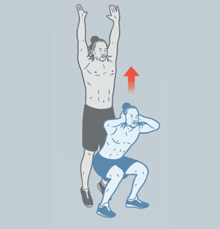 Ноги на ширине плеч, руки на затылке, локти разведены в стороны. Напрягите кор и, не округляя спину, опуститесь в полуприсед. Бедра параллельны полу. Выпрыгните, вытянув руки вверх, и снова примите исходную позицию. Крайне важно мягко приземляться.
