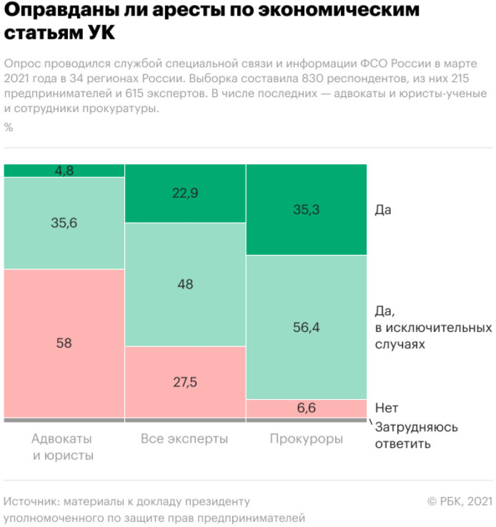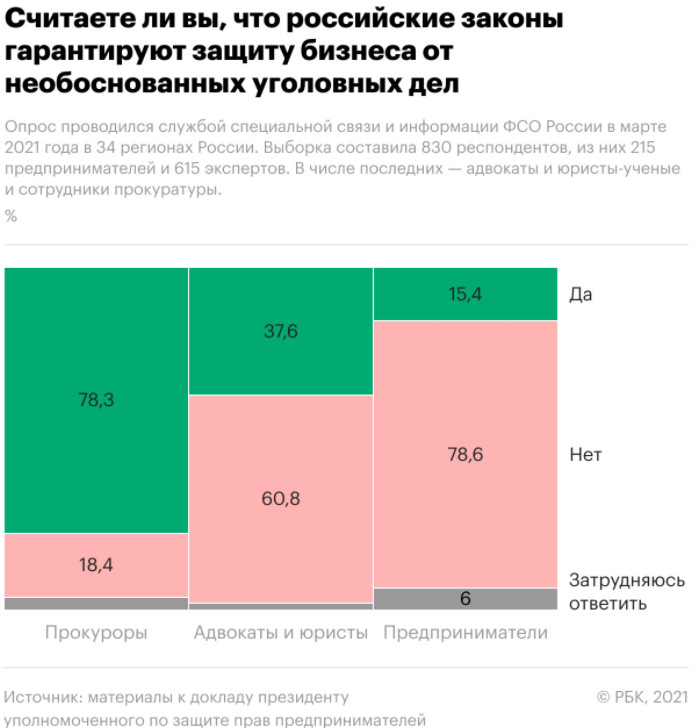 Титов ссылается на данные, полученные службой специальной связи и информации ФСО в ходе опроса, который проводился в марте 2021 года в 34 субъектах России. В опросе приняли участие 830 респондентов, в том числе 215 предпринимателей и 615 специалистов (250 ученых-юристов и адвокатов и 365 сотрудников прокуратуры).