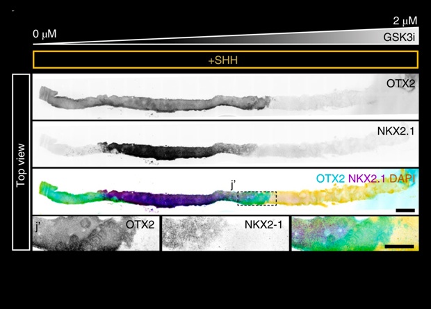 Биологи создали систему микрофлюидной подачи градиента вещества в культуру клеток, с помощью которой из стволовых клеток удалось вырастить регионализованную в ростро-каудальном направлении нервную ткань. Клетки разных частей полоски нервной ткани экспрессировали маркеры переднего, заднего или спинного мозга. На 14 день выращивания регионализация культуры соответствовала 8,5-дневному мышиному эмбриону. Модель является простым инструментом для исследования механизмов регионализации при эмбриональном развитии. Статья опубликована в журнале Nature Biotechnology.