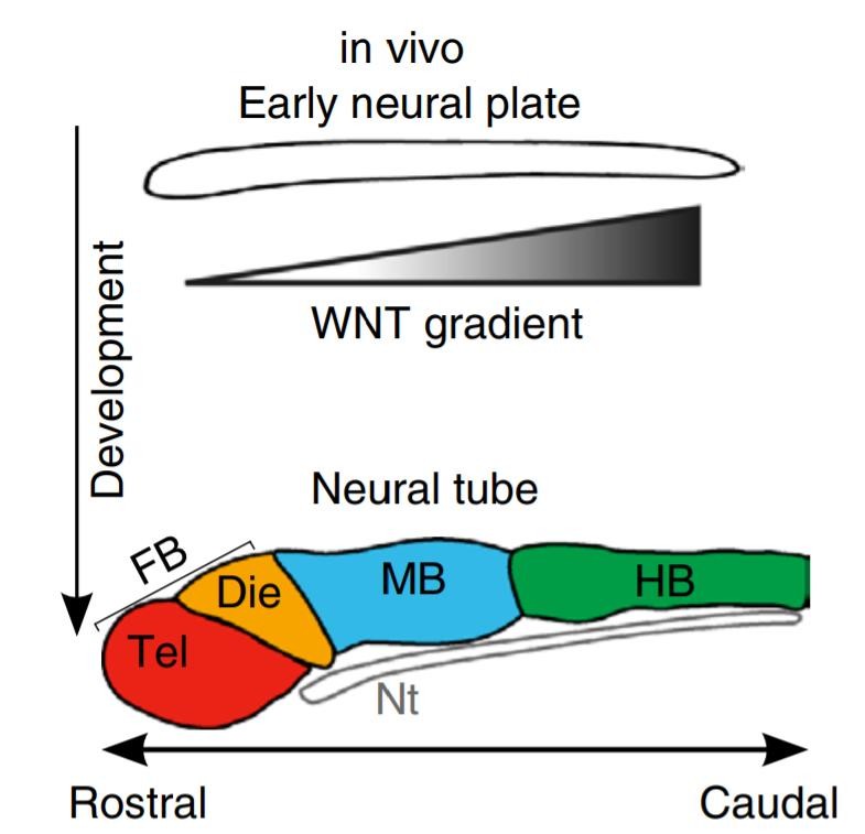 В ходе эмбрионального развития клетки однородной нервной трубки дифференцируются в различные отделы нервной системы. На судьбу каждой клетки влияют сигнальные вещества, в окружении которых те находятся. Дифференциацию нервной трубки в ростро-каудальном направлении (от головы к хвосту) обеспечивает градиент Wnt-белков: под его влиянием формируются три первичных отдела (пузыря) головного мозга и спинной мозг. Дальнейшее развитие этих структур определяют локальные градиенты других сигнальных веществ.