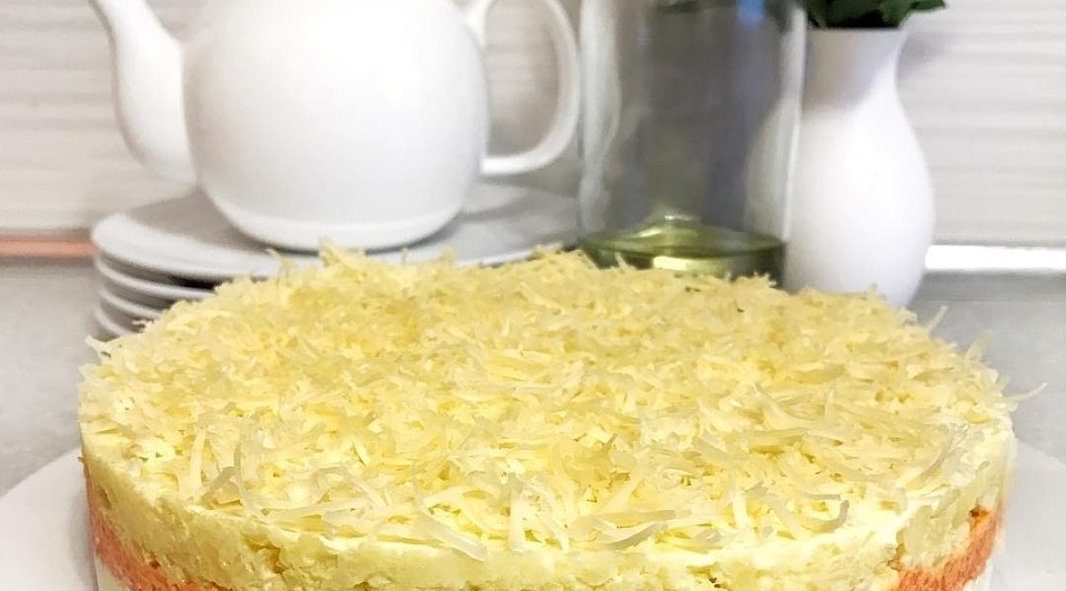 300 гр сыра, 6 картофелин, 4 моркови, 6 яиц, 400 гр рыбных консерв (более праздничный вариант — лосось или горбуша, также можно использовать тунец, сайру или сардины), майонез, 1 луковица (лучше салатная)