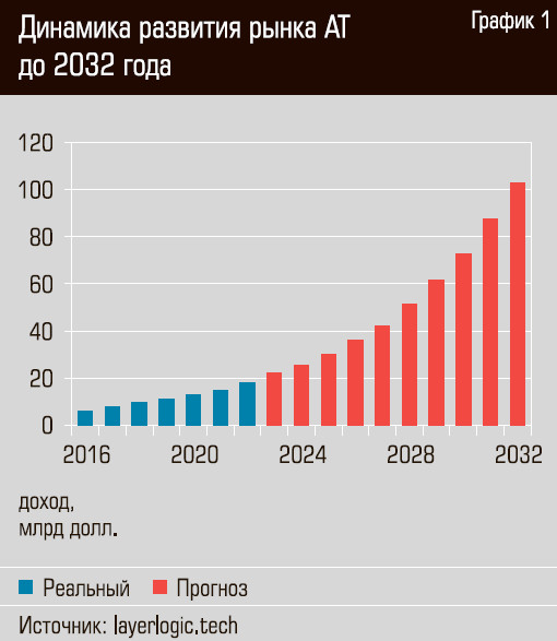 Прогнозируется, что общий объем мирового рынка аддитивного производства (оборудование, программное обеспечение, расходные материалы, специализированные системы для постобработки, производство по запросу) к 2032 году превысит 100 млрд долларов, примерно в шесть раз больше, чем в 2022 году (см. график 1).