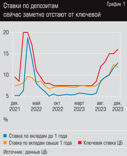 В среднем же, по данным тех же «Финуслуг», в топ-50 российских банков доходность депозитов на три месяца составляет 14,34%, на полгода — 14,3%, на год — 12,74%. Напомним, что ставка ЦБ на сегодняшний день составляет 16%. Если посмотреть на средние депозитные ставки, статистику по которым ведет Банк России (см. график 1), видно заметное их отставание от ключевой, которое началось как раз с ростом последней в августе 2023 года.