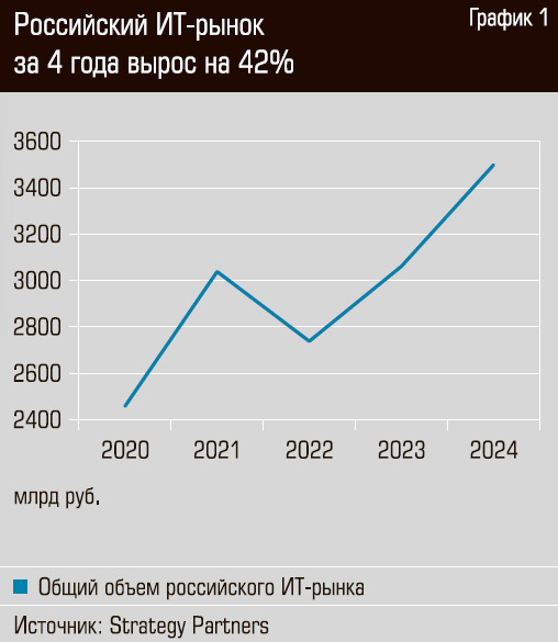 Формально общий объем российского ИТ-рынка растет хорошими темпами. По оценкам аналитической компании Strategy Partners, по итогам прошлого года, его объем превысил 3,5 трлн рублей, это на 14% больше, чем в 2023-м, и на 42% больше, чем в 2020 году (см. график 1). Мировой ИТ-рынок растет скромнее: по данным Gartner, по итогам 2024 года он достиг 4,9 трлн долларов и за последние четыре года средняя динамика его прироста составила 5% (см. график 2). Однако некоторые сегменты российского ИТ-рынка растут особенно быстро, еще больше опережая среднемировые темпы.