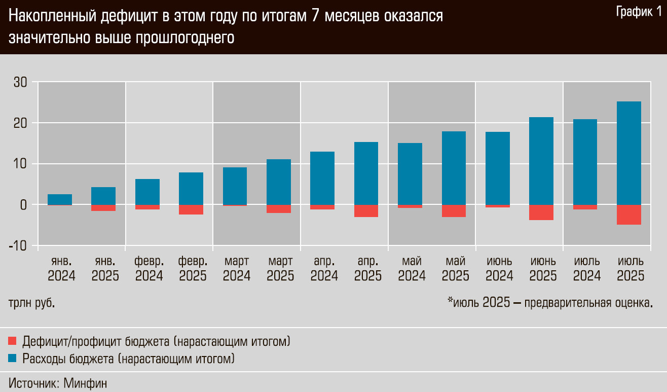 В итоге в январе–июле дефицит федерального бюджета составил 4,88 трлн рублей — на 3,78 трлн больше, чем за аналогичный период прошлого года. Но, по мнению финансистов, на исполнение целевых параметров структурного баланса в целом это не повлияет. Видимо, предполагается, что второе полугодие окажется профицитным.