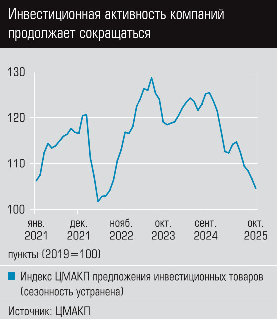 Как рассказал руководитель направления, замгендиректора ЦМАКП Владимир Сальников, прямой расчет по данным Росстата показывает, что инвестиции в машины и оборудование за январь–сентябрь 2025-го к аналогичному периоду прошлого года снизились почти на 8%. «Стоит напомнить, что у нас инвестиции в машины и оборудование только к 2021 году восстановились до уровня 2013-го, а в 2022 году по понятным причинам снова упали. Второй раз они восстановились до уровня 2013-го только в 2024 году, а сейчас опять пошли вниз», — говорит Владимир Сальников. Впрочем, по его словам, это было ожидаемо: индекс предложения инвестиционных товаров ЦМАКП давно показывает, что идет снижение предложения (производства и чистого импорта) машин и оборудования. По прогнозу ЦМАКП, в целом за 2025 год показатель будет примерно таким же, как за три квартала, или даже чуть хуже.