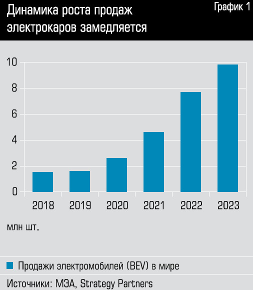 По данным Международного энергетического агентства (МЭА) и консалтинговой компании Strategy Partners, в 2023 году в мире было продано 9,8 млн «чистых» электромобилей (Battery electric vehicles, BEV) — аккумуляторных авто, которые передвигаются только на электрической тяге, без учета так называемых подключаемых гибридов PHEV. Это на 27% больше, чем в 2022 году, когда было продано 7,7 млн BEV. Прирост существенный, однако такая динамика в два с половиной раза ниже, чем в 2022-м (67%), и почти втрое ниже, чем в 2021-м (77%; см. график 1). В текущем году глобальные продажи BEV будут и дальше замедляться: аналитики предсказывают, что в лучшем случае прирост составит 20%. Это отдаляет время наступления тотального распространения электрокаров.