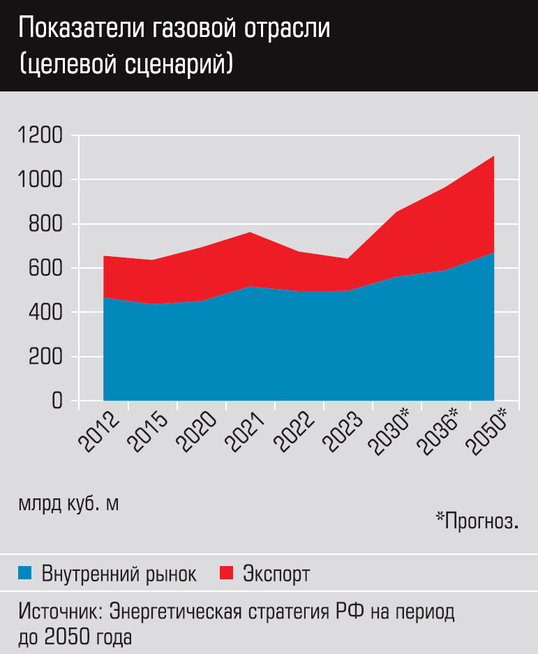 Именно в газовой отрасли прогнозируется самый большой процентный рост добычи. Производство газа к 2050 году должно вырасти почти на 73% относительно 2023 года и превысить 1 трлн 100 млн кубометров в случае реализации целевого сценария, заложенного в Стратегии. Инерционный сценарий предполагает меньшие показатели, но поскольку именно целевой в приоритете, мы будем оперировать данными, которые относятся к нему.