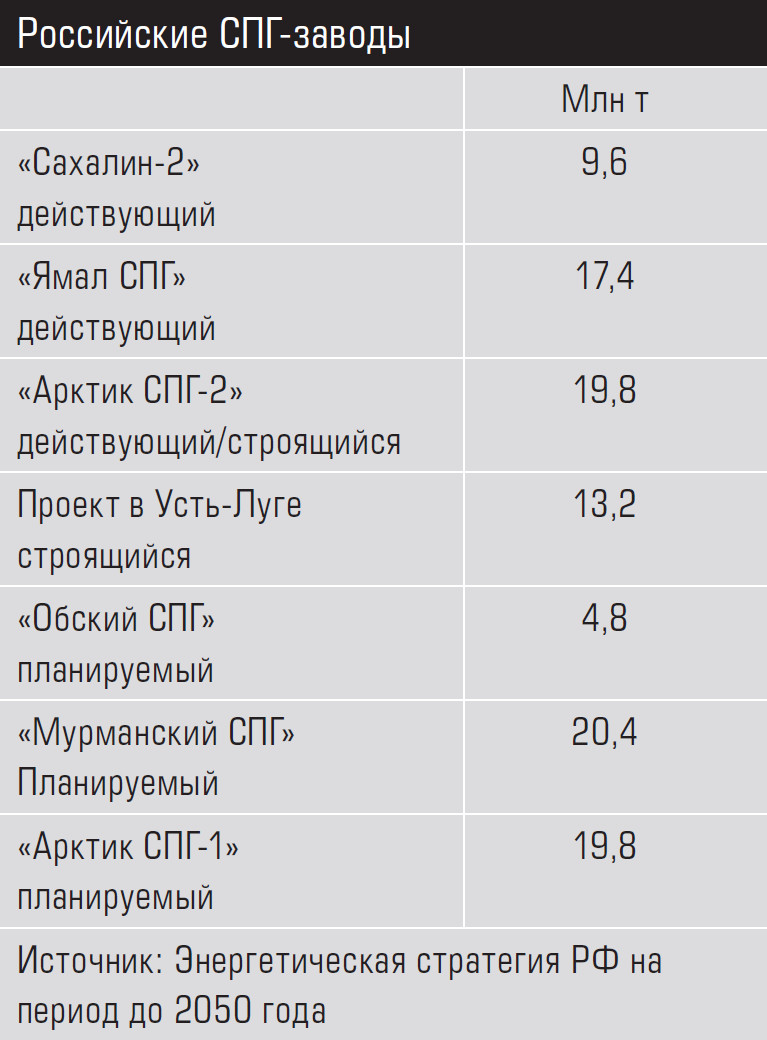 Стратегия предполагает, что к 2030 году должны быть построены пять заводов СПГ: комплекс по переработке газа в Усть-Луге (проект «Газпрома» и компании «Русгаздобыча») и четыре проекта «НоваТЭКа» (см. таблицу). Вместе с уже действующими «Сахалин-2» («Газпром») и «Ямал-СПГ» («НоваТЭК») в сумме их производство составит как раз 105 млн тонн.